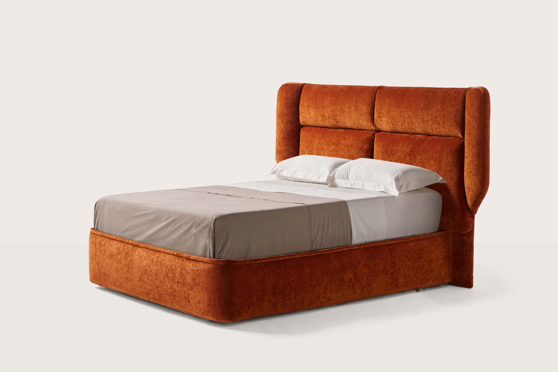 Con una altura de 140 cm y un espesor de 17 cm, Flow se distingue por sus volumétricas “alas” laterales que envuelven al usuario, creando un espacio íntimo y protector. Disponible en anchos de 140, 150, 160, 180, 200 y 220 cm (más 27 cm extra por cada ala), integra discretamente estructura y acolchado, elevando el cabecero a pieza escultórica esencial en el dormitorio.